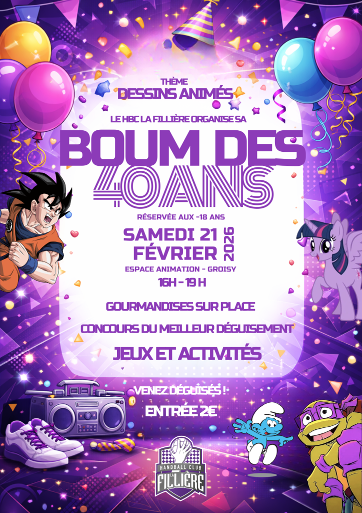 Samedi 21 février nous organisons notre boum spéciale 40 ans, réservée aux moins de 18 ans, pour un après-midi de fête à la Salle d’animation de Groisy de 16h à 19h !